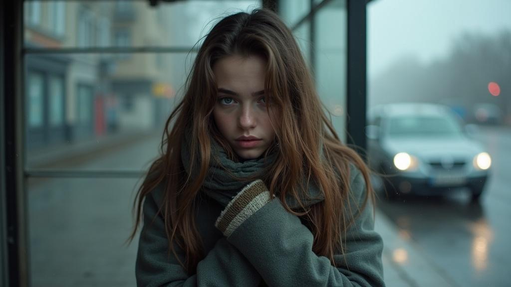 Девушка стояла на автобусной остановке, кутаясь в тонкий плащ и тщетно пытаясь укрыться от ледяного ветра за остатками пластиковых панелей полуразрушенного павильона, пострадавшего от выходок местных подростков. Несмотря на то что дворники лобового стекла с трудом справлялись с потоками воды даже при максимальной скорости, я сразу заметил её — яркая одежда выделяла её среди серого пейзажа. Мне стало жаль промокшую до нитки девушку, и я решил остановиться. Сдал назад к самому краю остановки и опустил боковое стекло: