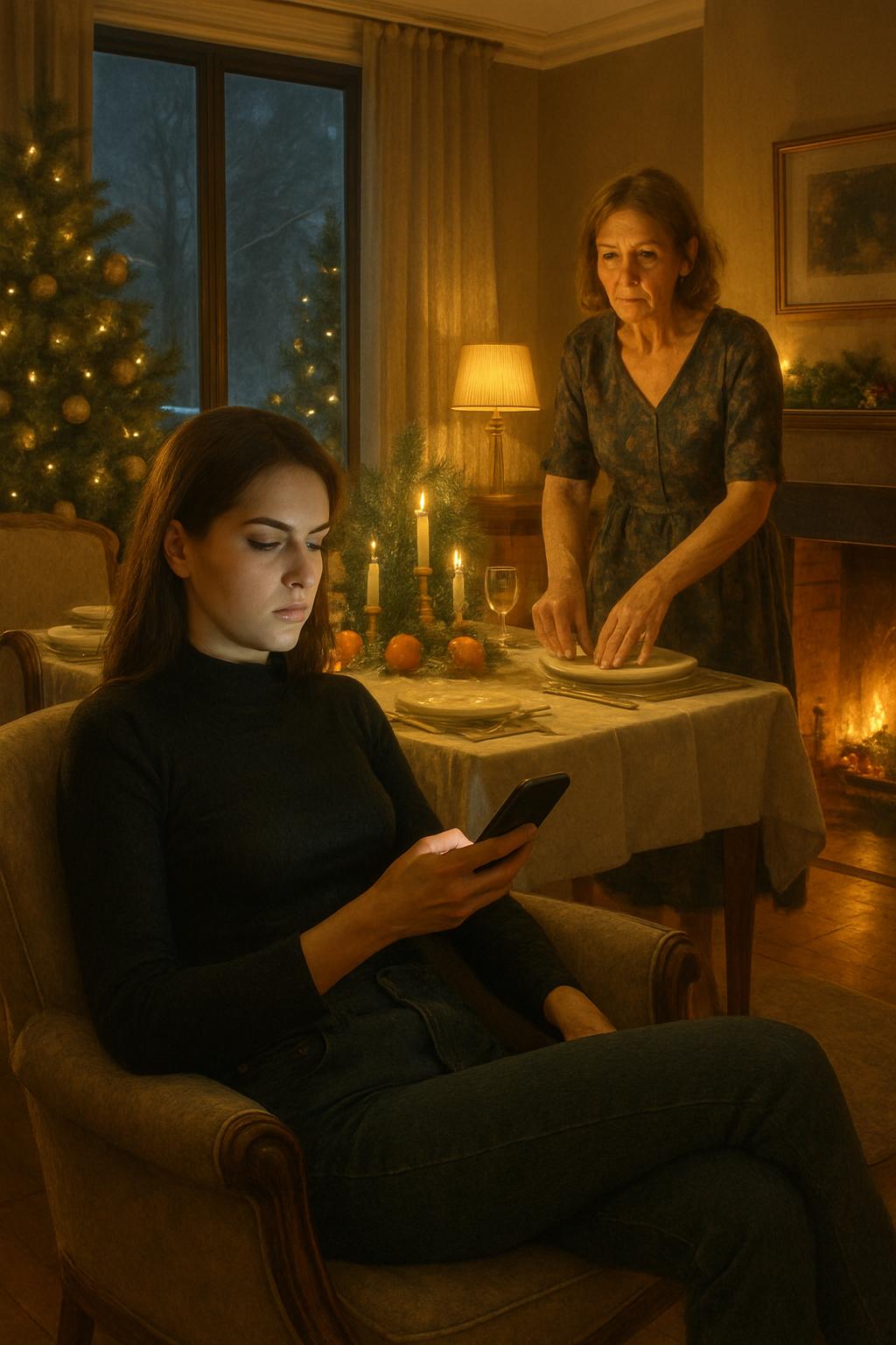 Александра устроилась в кресле с телефоном в руках. Её ухоженные пальцы быстро скользили по экрану, а лицо выражало скучающее превосходство. Казалось, ей было совершенно безразлично всё: ни старания свекрови её не трогали, ни сам факт того, что вся семья наконец-то собралась вместе.