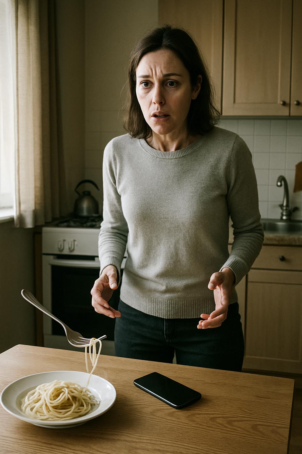 Телефон выскользнул из рук и с глухим стуком упал на кухонный стол. Вилка со спагетти застыла в воздухе, так и не дойдя до губ.