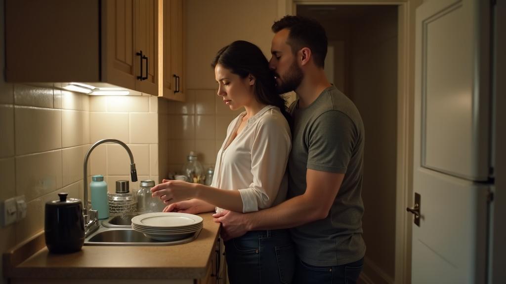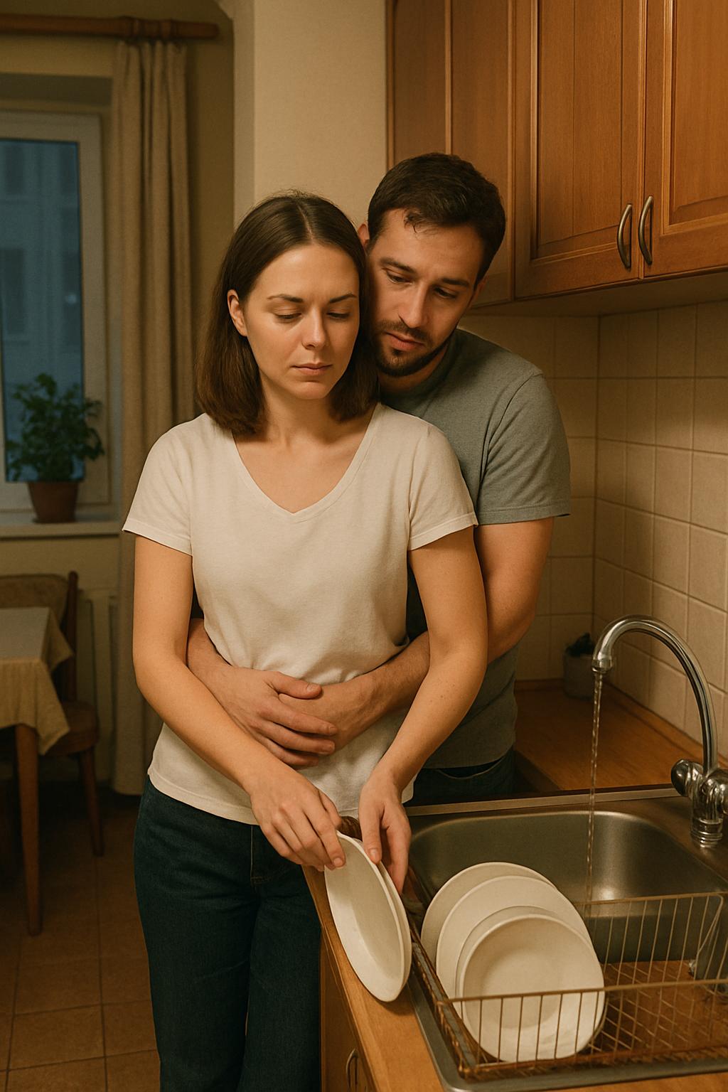 Оксана мыла посуду после ужина, когда Александр подошёл сзади и обнял её за талию. Он прижал подбородок к плечу жены и на мгновение замолчал.
