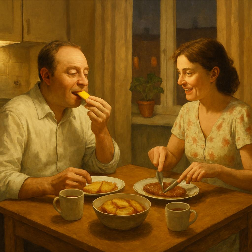 — Картошка сегодня получилась особенно вкусной. Прямо как в детстве, — с удовольствием сказал Александр, подцепив на вилку румяный ломтик и отправив его в рот. Он прикрыл глаза, наслаждаясь вкусом. — А эти твои котлеты… просто чудо.