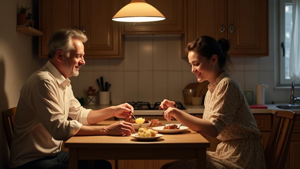 Мария ответила ему улыбкой — не натянутой, как после тяжёлого дня, а искренней и тёплой. Такие вечера она любила особенно. Только они вдвоём на своей небольшой, но уютной кухне. За окном сгущались синие сумерки ноября, а внутри горел мягкий свет, пахло жареным мясом и свежим укропом. В такие моменты казалось, что все заботы остались где-то за пределами их маленького мира.