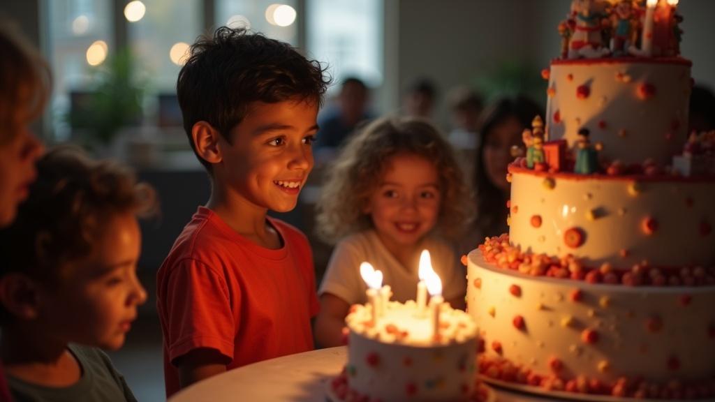 Данил подошёл к торту. Он прикрыл глаза, собираясь загадать самое заветное желание. Пламя свечей дрожало, отбрасывая теплый свет на его радостное лицо.