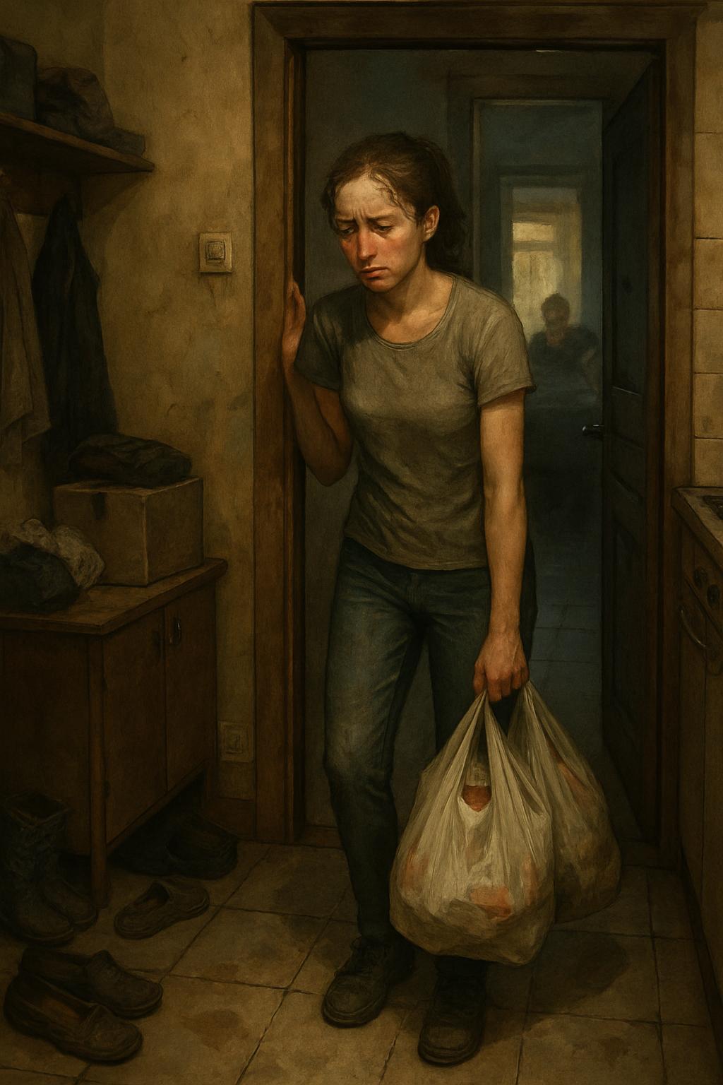 Александра захлопнула за собой дверь и на мгновение прислонилась к косяку, пытаясь перевести дыхание. Ремни тяжёлых пакетов с продуктами больно врезались в ладони. В прихожей царил беспорядок: обувь была разбросана по полу, а на плитке виднелись какие-то странные пятна.