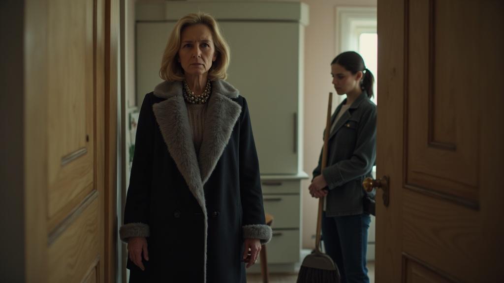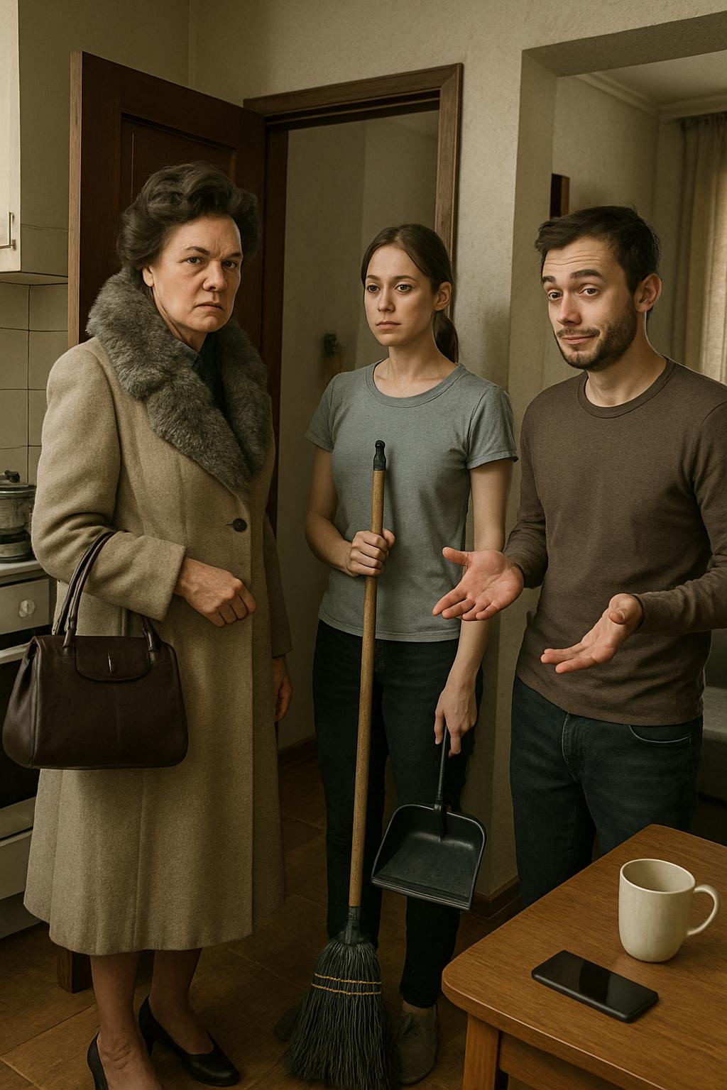 Оксана, держа веник в одной руке и совок в другой, вздрогнула и обернулась. Вера стояла в пальто с серым мехом, сумка висела на сгибе локтя, а лицо выражало явное раздражение.