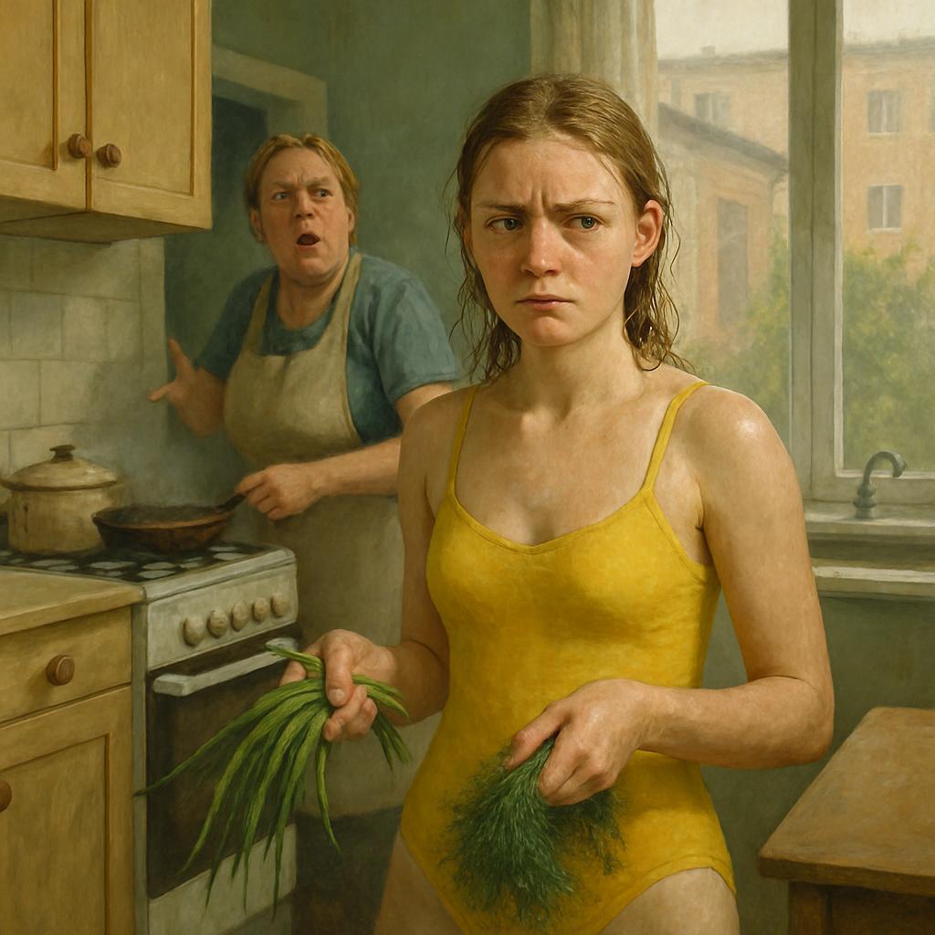 — Оксанка, хватит в воде разлеживаться, принеси зелени на суп! — крикнула Галина так, что эхо пошло по улице.