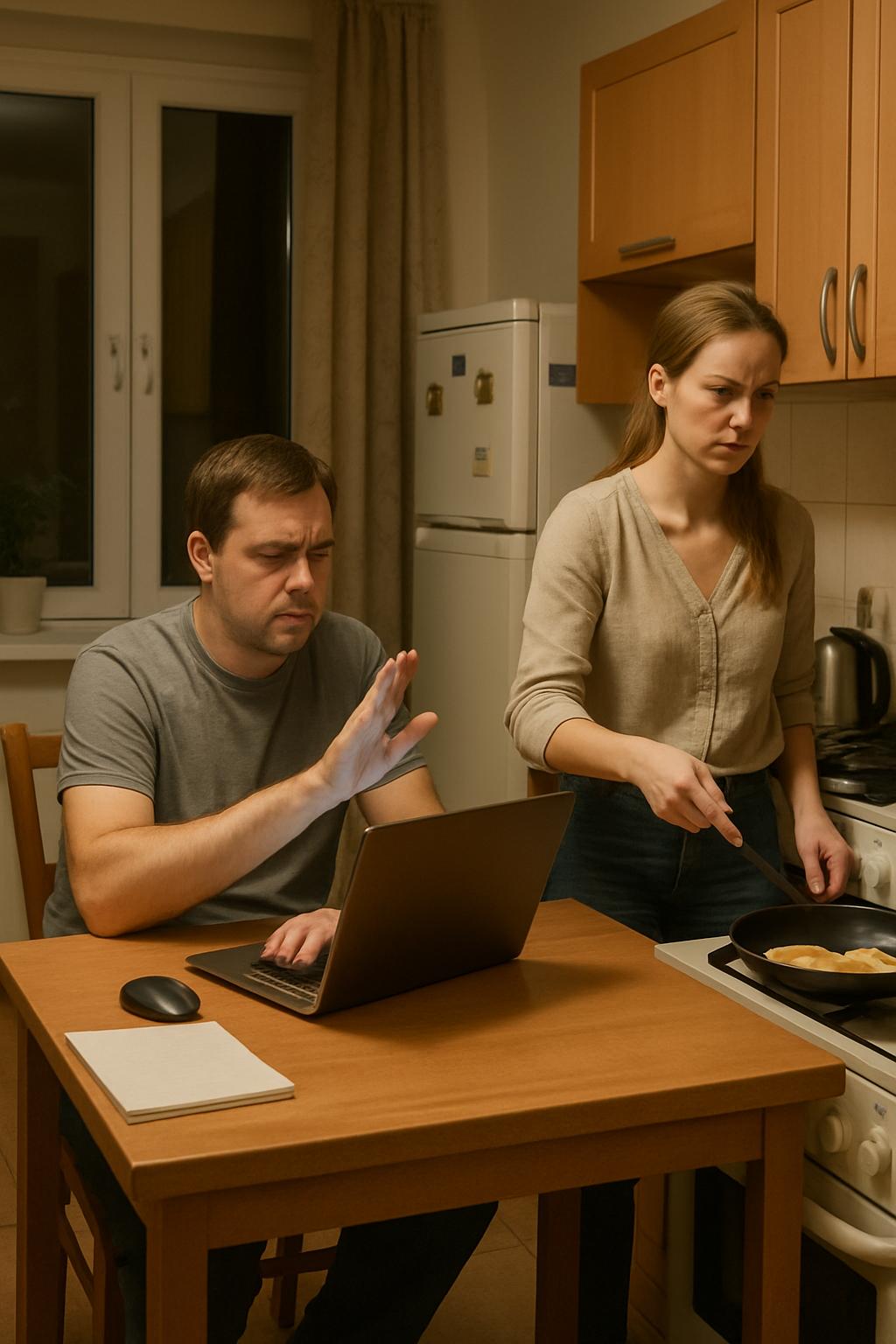 Я стояла у плиты, готовя яичницу. Дмитрий — ему тридцать четыре — расположился за столом в наушниках. Взгляд прикован к ноутбуку, пальцы быстро бегают по клавиатуре.