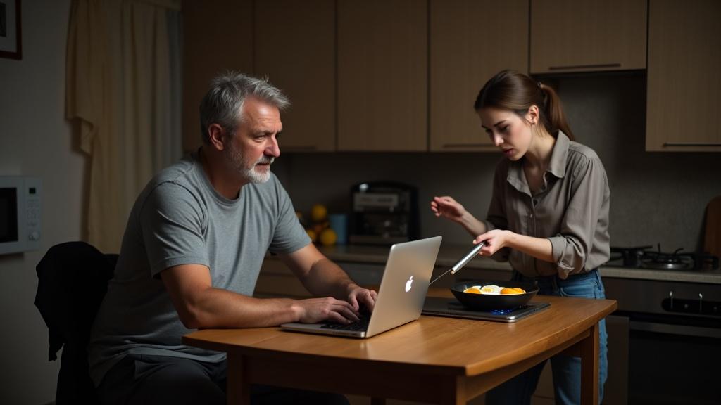 Я стояла у плиты, готовя яичницу. Дмитрий — ему тридцать четыре — расположился за столом в наушниках. Взгляд прикован к ноутбуку, пальцы быстро бегают по клавиатуре.