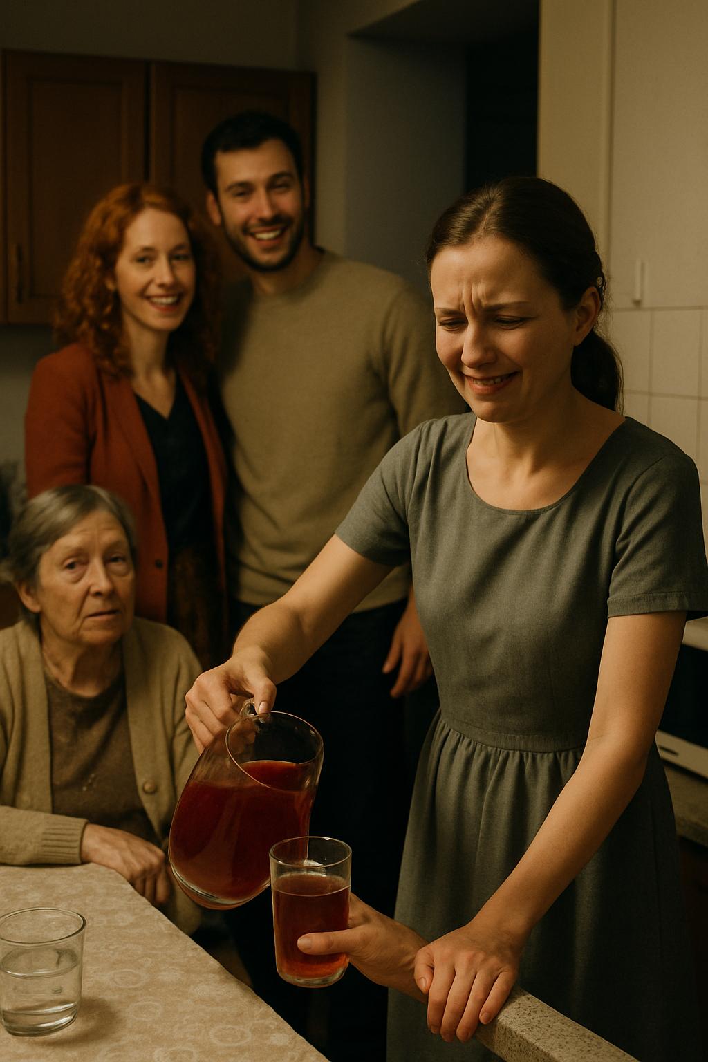 Оксана только что стянула с себя фартук и опустилась за стол — вся семья уже ждала начала ужина. Она наполнила матери стакан компотом из графина, затем повернулась к свекрови с тем же предложением.