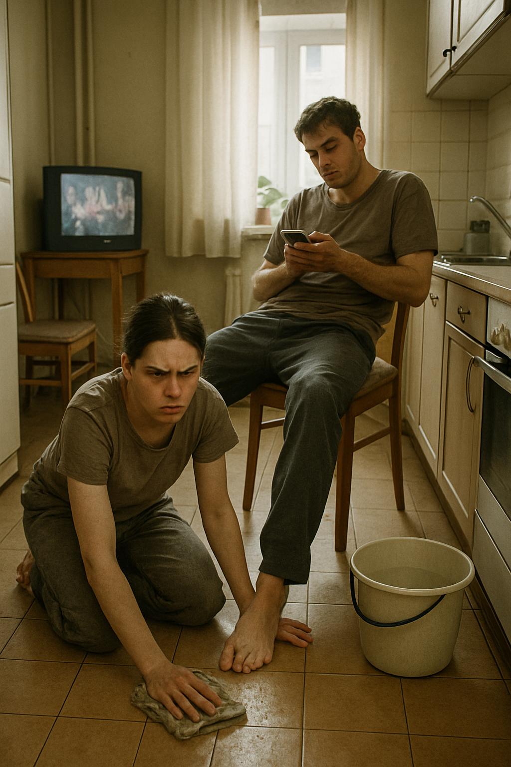 Он медленно, почти лениво, перевёл взгляд с телефона на сестру. Окинул её сверху вниз: согнутая спина, мокрая тряпка в руке. В его глазах читалось полное равнодушие — будто перед ним не человек, а предмет интерьера. Затем он приподнял ногу сантиметров на десять, позволяя ей буквально проползти под ней. Подержал мгновение и опустил обратно.