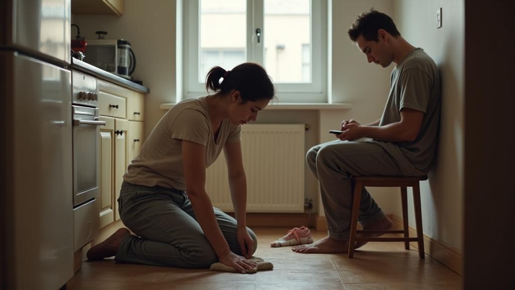 Он медленно, почти лениво, перевёл взгляд с телефона на сестру. Окинул её сверху вниз: согнутая спина, мокрая тряпка в руке. В его глазах читалось полное равнодушие — будто перед ним не человек, а предмет интерьера. Затем он приподнял ногу сантиметров на десять, позволяя ей буквально проползти под ней. Подержал мгновение и опустил обратно.