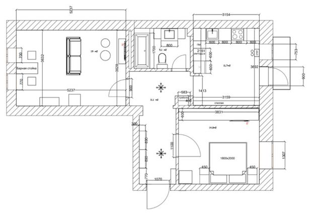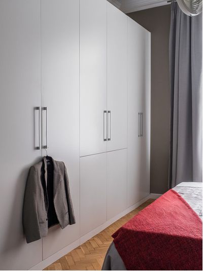Площадь спальни примерно равна размерам гостиной (16 кв.м), и если смотреть только на план, логично было бы поменять назначение комнат в ходе ремонта — передвинуть кровать в самую дальнюю от входа комнату. Но нужно еще учитывать ориентацию квартиры: спальня и кухня выходят окнами в тихий двор, а гостиная — на набережную и закат. Нынешнее назначение комнат виделось архитектору и владельцам самым оправданным.
