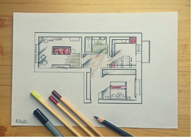 На фото: эскиз архитектора Руслана Кирничанского с финальной расстановкой мебели и цветовым кодированием — оттенок дивана повторяется в аксессуарах других комнат