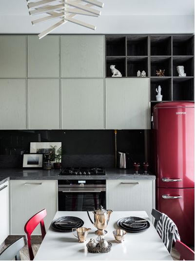 На фото: гарнитур «Кухни Мария»; холодильник Gorenje; светильник Flight от Centrsvet; декор — подсвечник из стекла и металла Estello и кактус из металла Aneko — от La Redoute Interieurs; сервировка посуды и статуэтка мопса — от Home Concept; краска для потолков от Kansai