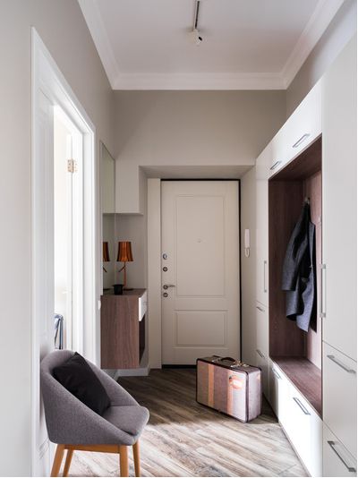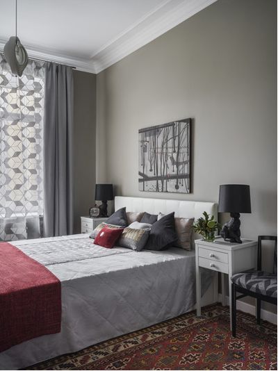 Площадь спальни примерно равна размерам гостиной (16 кв.м), и если смотреть только на план, логично было бы поменять назначение комнат в ходе ремонта — передвинуть кровать в самую дальнюю от входа комнату. Но нужно еще учитывать ориентацию квартиры: спальня и кухня выходят окнами в тихий двор, а гостиная — на набережную и закат. Нынешнее назначение комнат виделось архитектору и владельцам самым оправданным.
