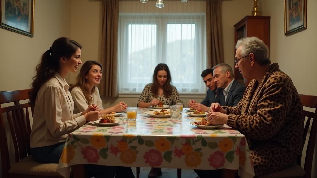 Ужин в честь годовщины свадьбы. По идее — романтика, свечи, шампанское. Ага, мечтай. У нас — клеёнка с цветочками на столе, телевизор орёт на фоне, свекровь в своём любимом леопардовом халате и поток колких замечаний в мой адрес. И это только начало вечера.