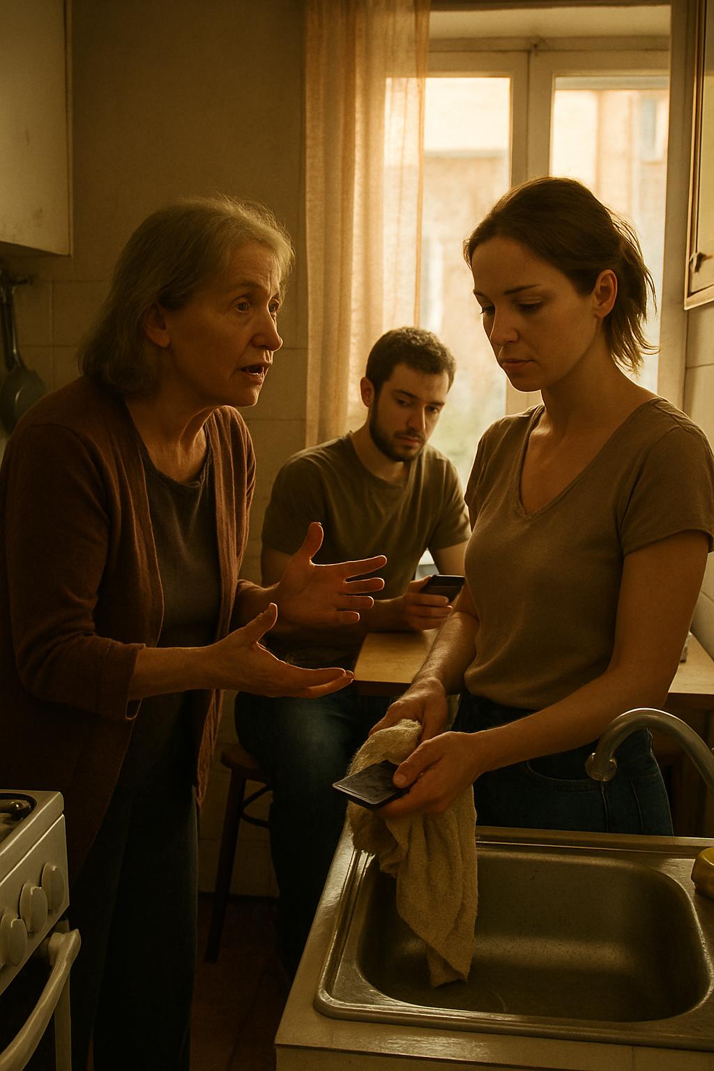 Свекровь Вера стояла на кухне и пристально смотрела на меня. Дмитрий сидел за столом, молча листал что-то в телефоне. Я мыла посуду, затем вытерла руки полотенцем.