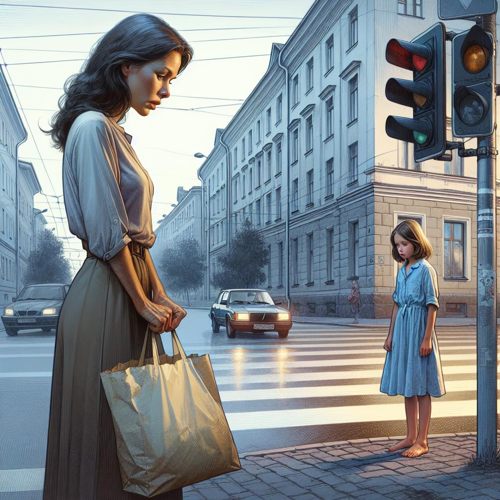 Мария с трудом несла тяжёлые пакеты из супермаркета, обдумывая, что приготовить на ужин. Перейдя улицу, она заметила у светофора девочку лет одиннадцати-двенадцати в лёгком голубом платьице.