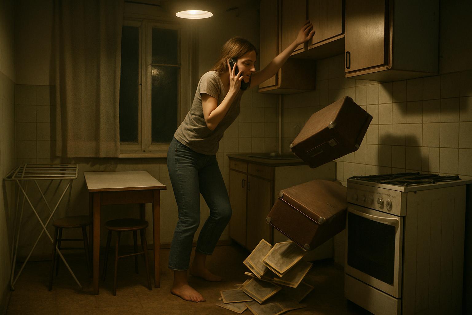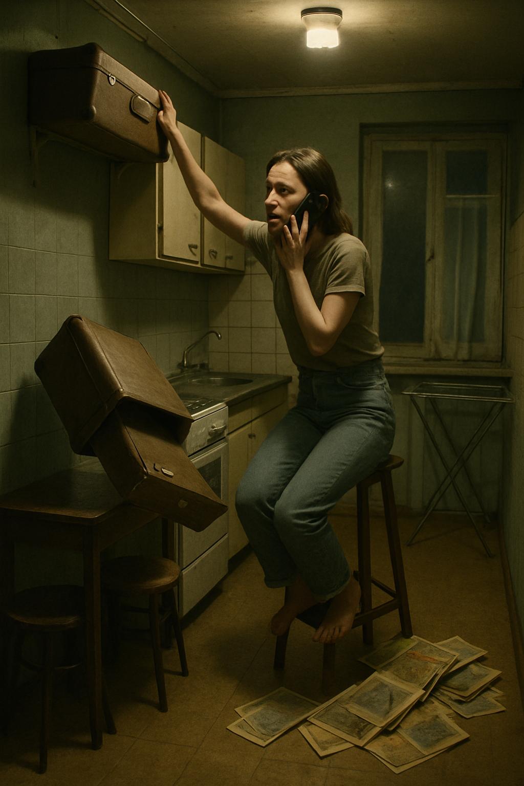 Поздний вечер. Анастасия, стараясь удержать равновесие на старой табуретке, тянулась к антресоли. Телефон она прижимала плечом к уху, а кончики пальцев едва доставали до ручки покрытого пылью чемодана.