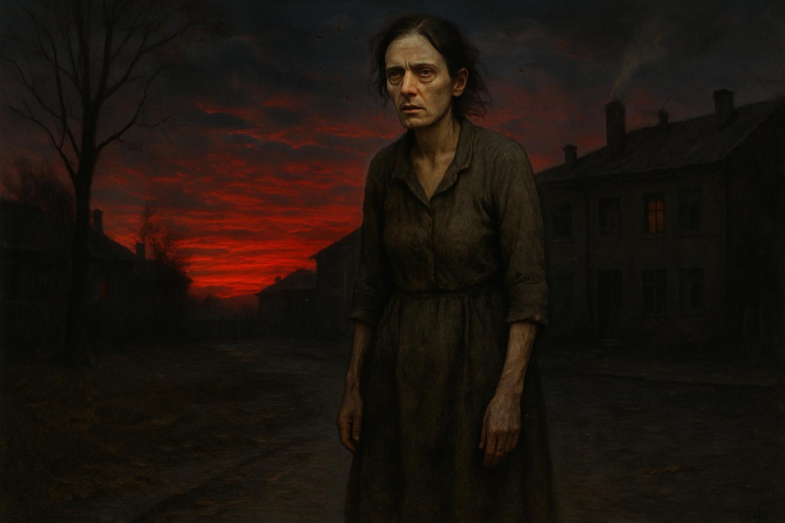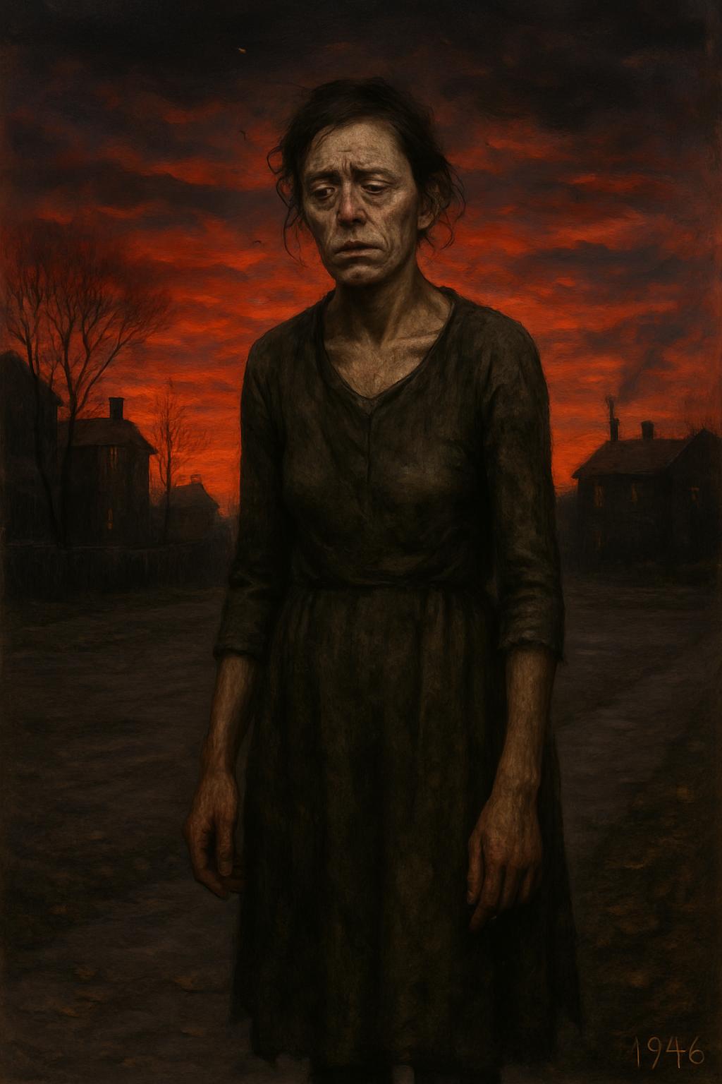 Хмурый осенний вечер 1946 года неторопливо спускался на деревню, окрашивая небосвод в глухие, тоскливые оттенки уходящего дня. Мария замерла на краю пустыря, не сводя взгляда с багровой полосы заката. В воздухе смешались запах сырой листвы и дым из труб — становилось все прохладнее, а назойливые комары кружили у ее усталого лица. И все же, несмотря на холод и насекомых, она не находила в себе сил сдвинуться с места.