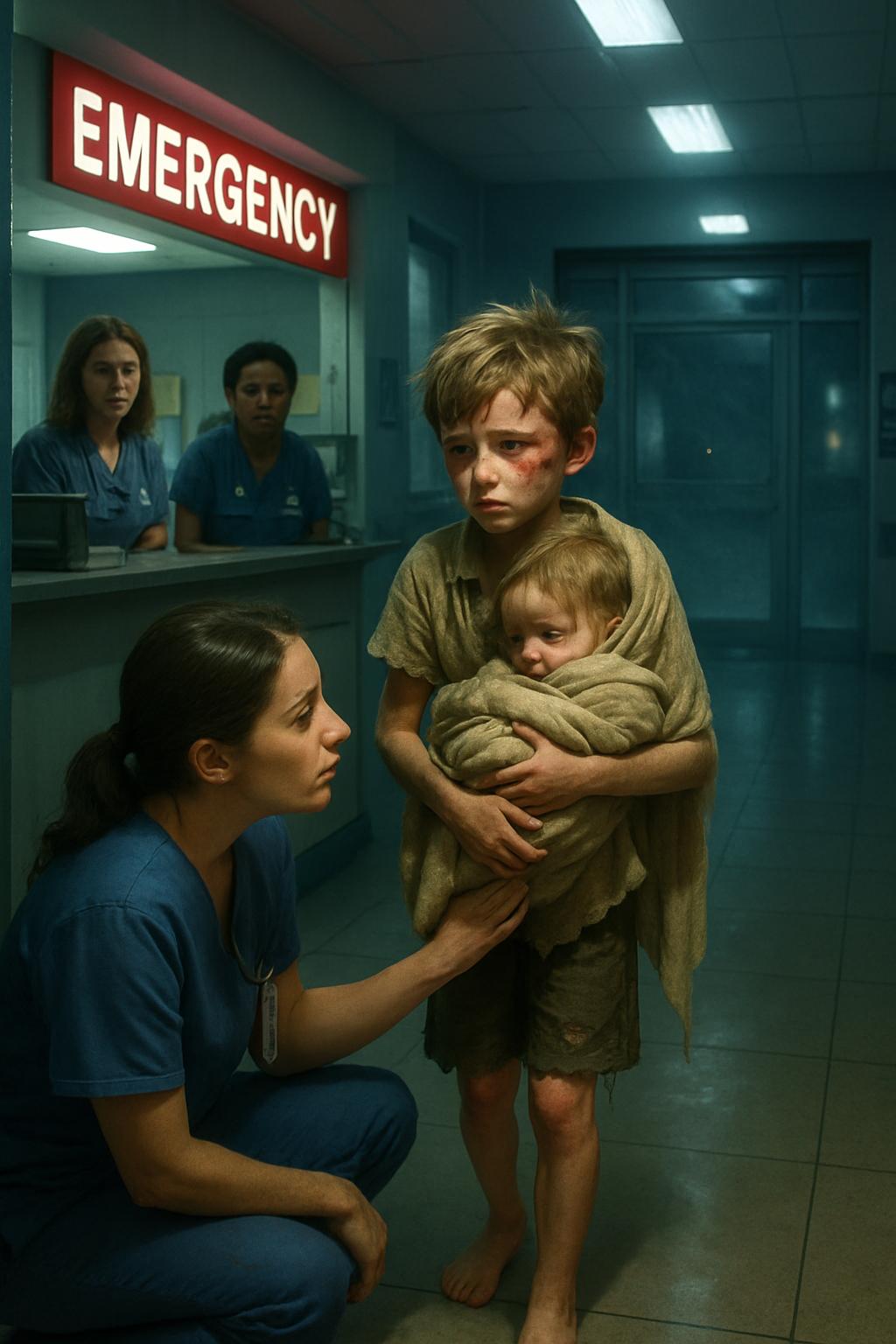 Мальчик семи лет с травмами появился в отделении неотложной помощи, держа на руках свою младшую сестру — его слова тронули до глубины души… Было немного позже часа ночи, когда маленький Иван вошёл в приёмное отделение больницы Святой Екатерины в Вермонте. Он крепко прижимал к себе младшую сестрёнку, закутанную в тонкое, потускневшее от времени одеяло. За его спиной ворвался ледяной порыв ветра, скользнув по босым ногам мальчика, когда двери распахнулись.