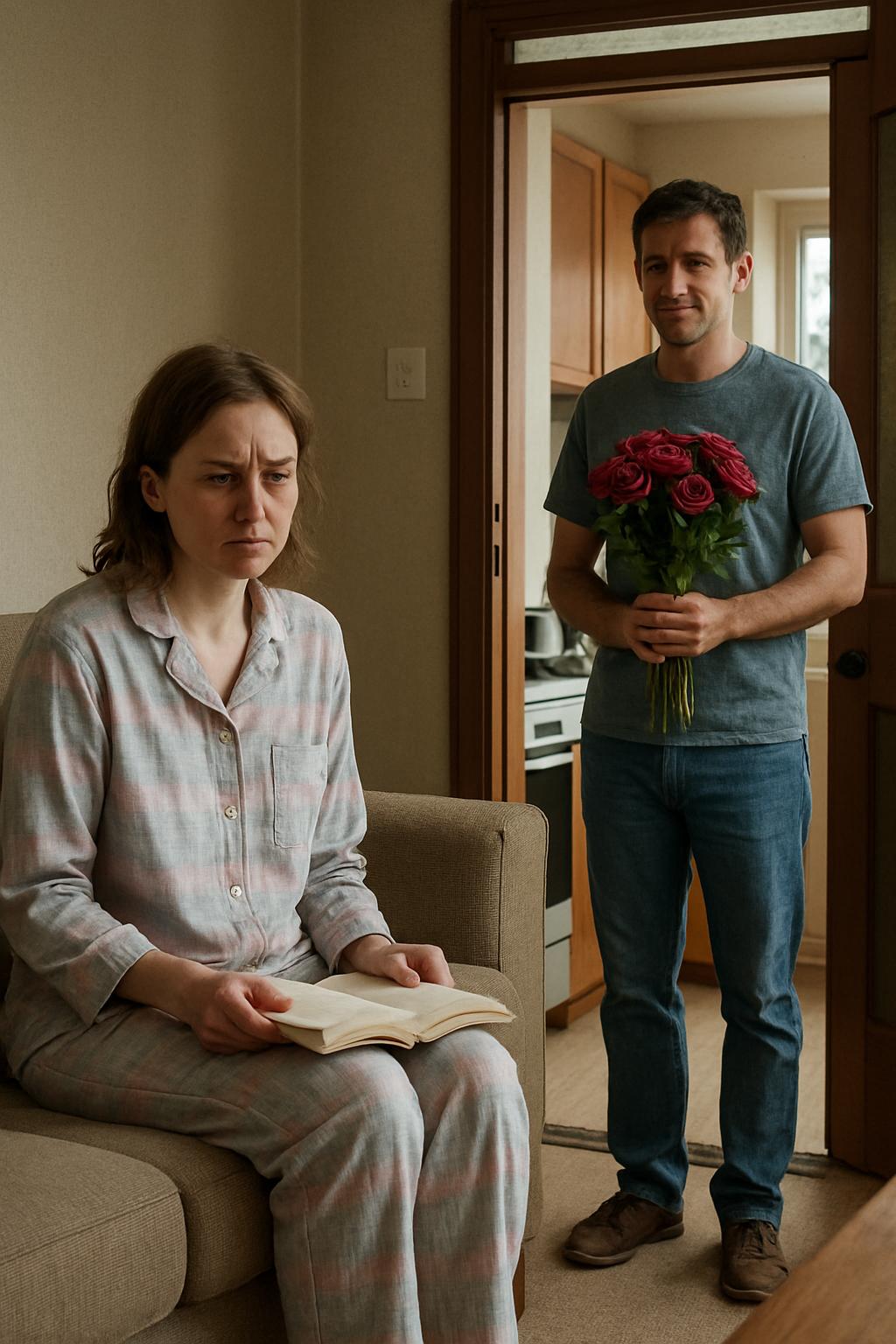 На пороге оказался её муж, Богдан. В руках он держал букет роз, а на лице застыла натянутая улыбка — словно приклеенная маска.