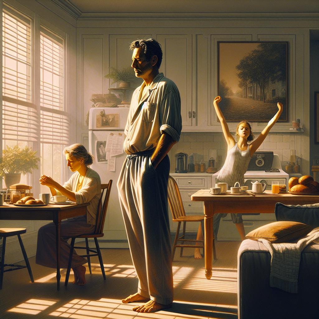 Он наблюдал, как его жена Ольга аккуратно расставляла на столе тарелки для завтрака, а их дочь, лениво потягиваясь, выходила из своей комнаты.