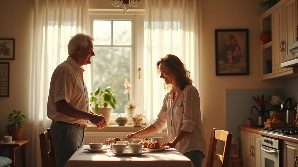 Он наблюдал, как его жена Ольга аккуратно расставляла на столе тарелки для завтрака, а их дочь, лениво потягиваясь, выходила из своей комнаты.