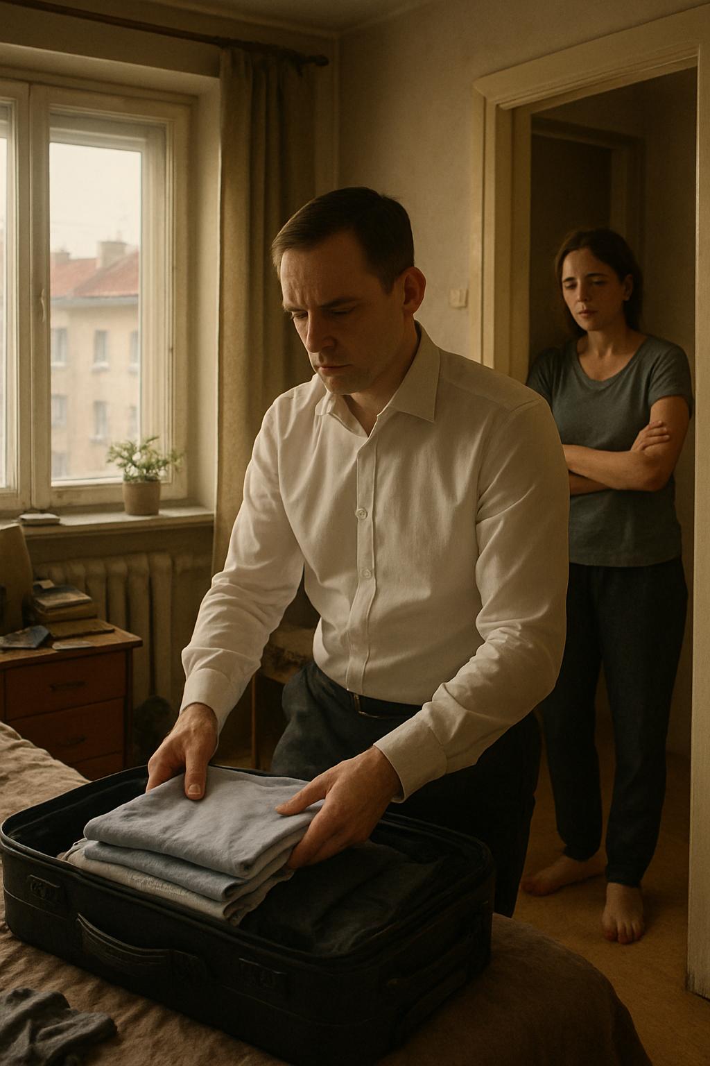 Он стоял посреди комнаты с раскрытым чемоданом и аккуратно складывал туда рубашки, костюмы и галстуки. Движения были уверенными и чёткими — словно он заранее отрепетировал этот момент.