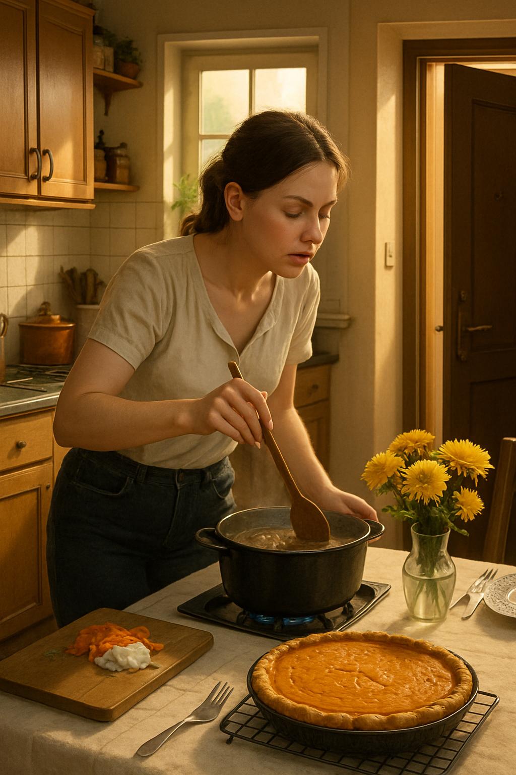 Оксанка стояла у плиты, аккуратно помешивая густой грибной суп деревянной ложкой. По кухне разносился насыщенный аромат жареного лука с морковью, шампиньонов и свежей зелени, вплетаясь в сладковатый запах тыквенного пирога, который остывал на решётке у окна.