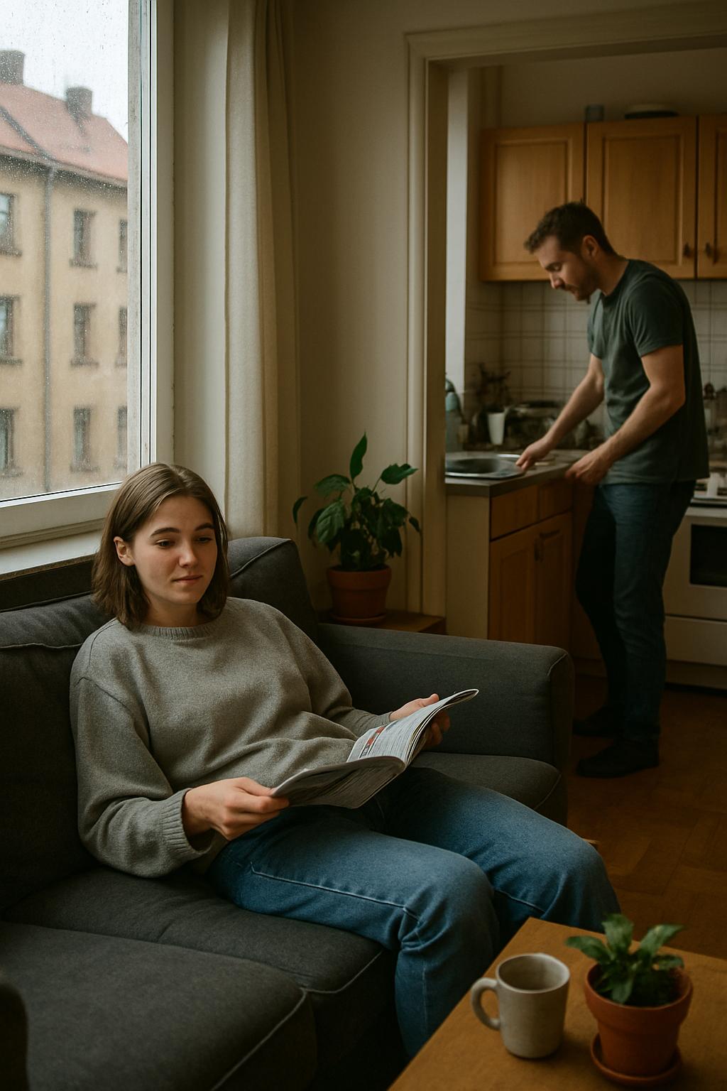 Ирина устроилась на диване, лениво перелистывая журнал и почти не вникая в содержание. За окном накрапывал осенний дождь, по стеклу медленно тянулись тонкие водяные дорожки. Из кухни доносился лязг посуды — Владислав что‑то искал, периодически недовольно бормоча себе под нос. Ирина невольно усмехнулась: наверняка снова пытался отыскать ту самую сковородку, которая неизменно «пряталась» на нижней полке шкафа.