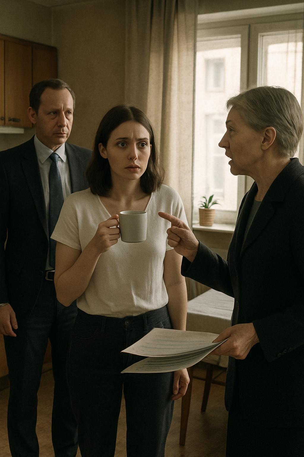 Дарина застыла, не донеся чашку кофе до губ. В центре гостиной стояла её свекровь с каким-то документом в руках, а рядом переминался с ноги на ногу незнакомец в деловом костюме.