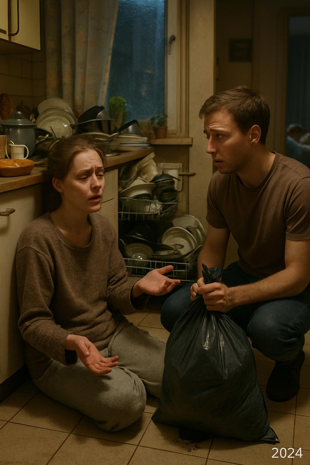 Мирослав неловко переступал с ноги на ногу, держа в руках мусорный пакет, из которого уже начинала сочиться жидкость на ламинат.