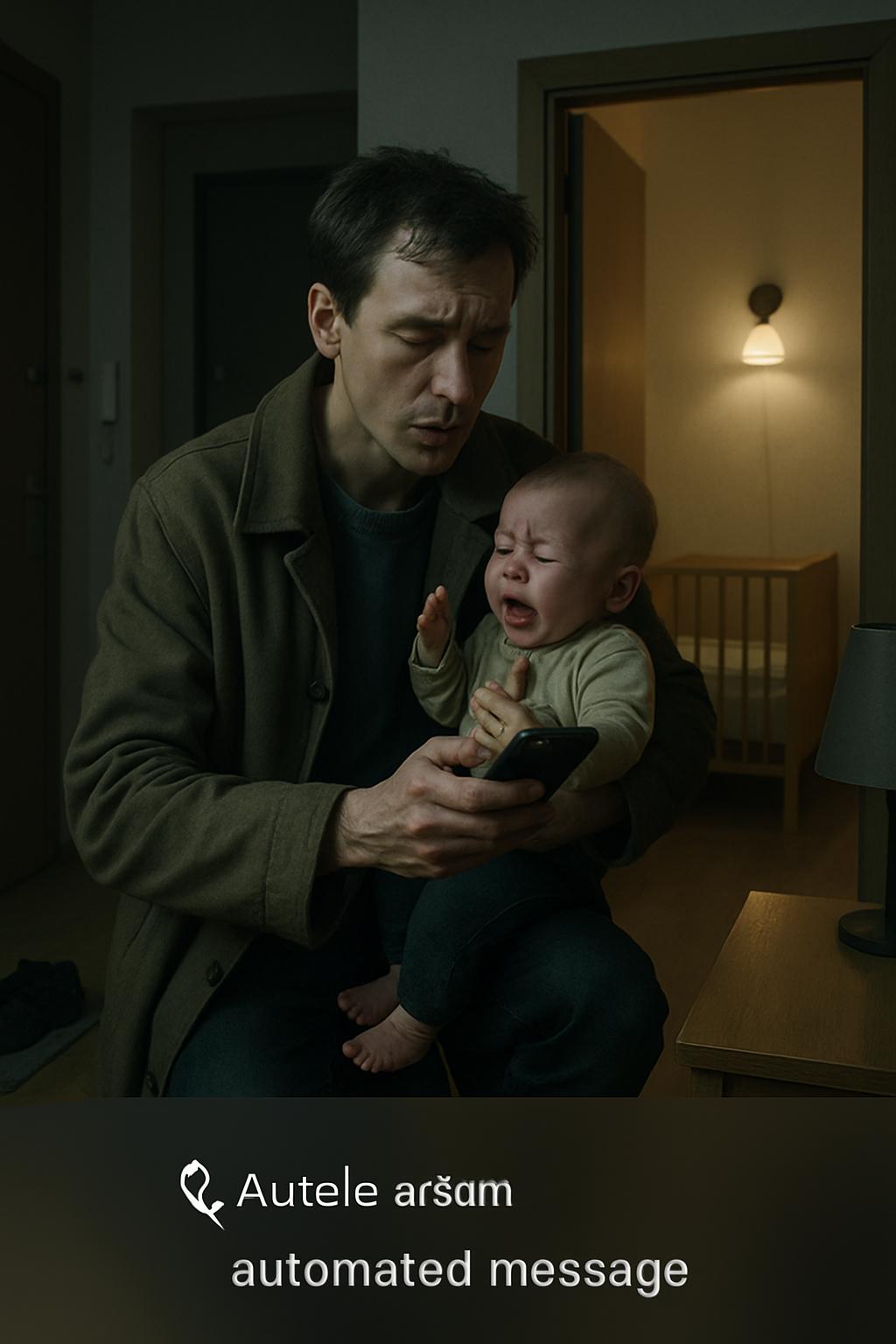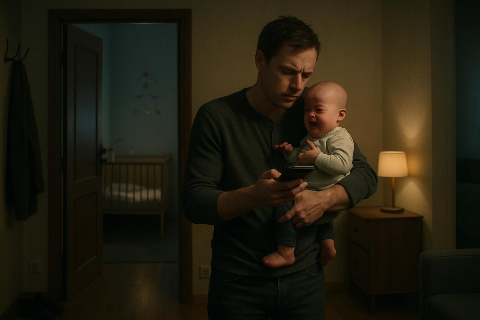 «Тише-тише, папа рядом», — мягко произнёс он, поднимая малыша на руки. «И где же наша мама, а?»