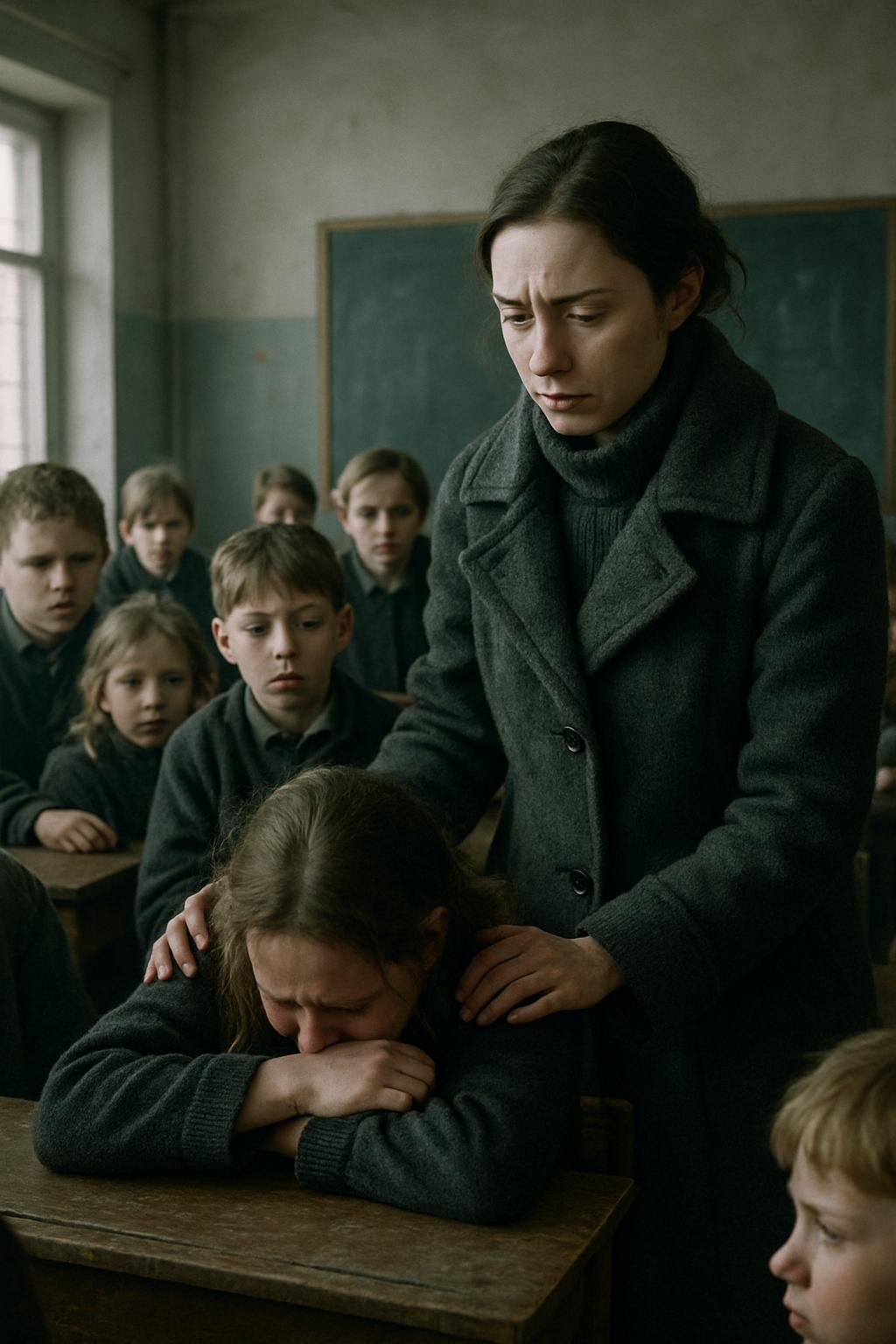 Мария резко повернулась и направилась прямо в свой класс, минуя учительскую. Там уже собралось больше половины учеников: они столпились вокруг парты, за которой сидела худенькая девочка с темными волосами и опущенной головой — она беззвучно плакала на сложенных руках. Одноклассники пытались ее утешить шепотом и протягивали ей мелок.