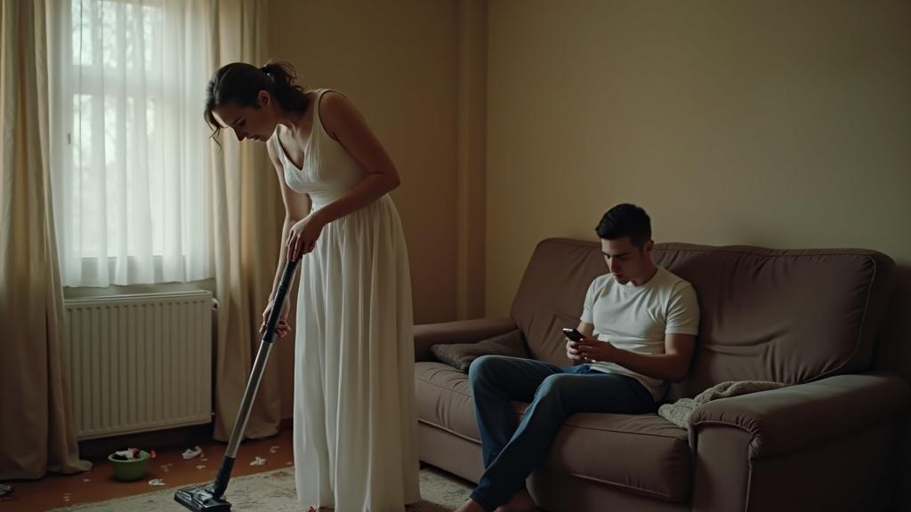 Богдан развалился на диване с телефоном в руках; Оксана пылесосила квартиру сама — стиснув зубы от злости и обиды. Где-то внутри копилось раздражение тяжёлым грузом… но она старалась держать себя в руках и внушала себе: «Всё наладится».