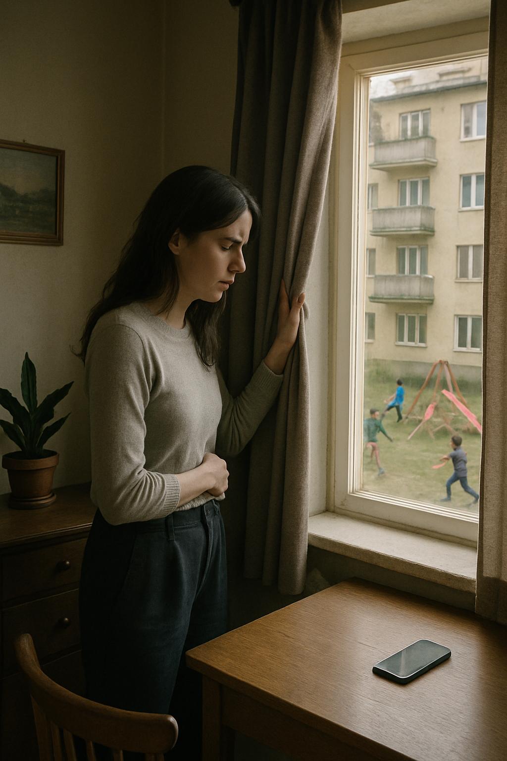 Оксана стояла у окна, не двигаясь. Её взгляд, полный грусти и тяжести, был устремлён во двор. Там кипела совсем иная жизнь — яркая, шумная, наполненная детским смехом и беззаботностью. Малыши разных возрастов были увлечены своими играми. В песочнице несколько детей с воодушевлением строили сложные замки: они тщательно ровняли стены, возводили башенки, переговаривались и дружно смеялись над своими маленькими промахами.