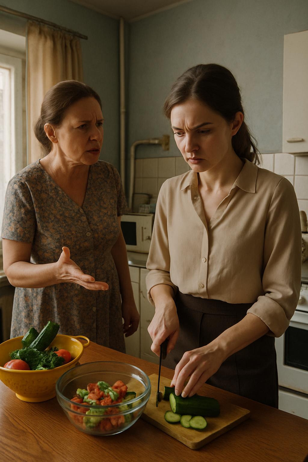 – Оксана, милая, ну кто же так шинкует огурцы в салат? Посмотри на это – не кубики, а какие-то булыжники! Как такое есть? У мужчин, между прочим, челюсти не из стали – им нужна мягкость и забота… – Людмила стояла рядом, наблюдая за тем, как Оксана в спешке дорезала оливье.