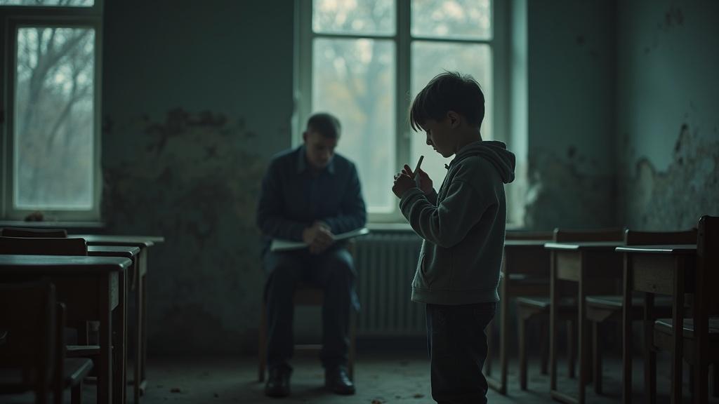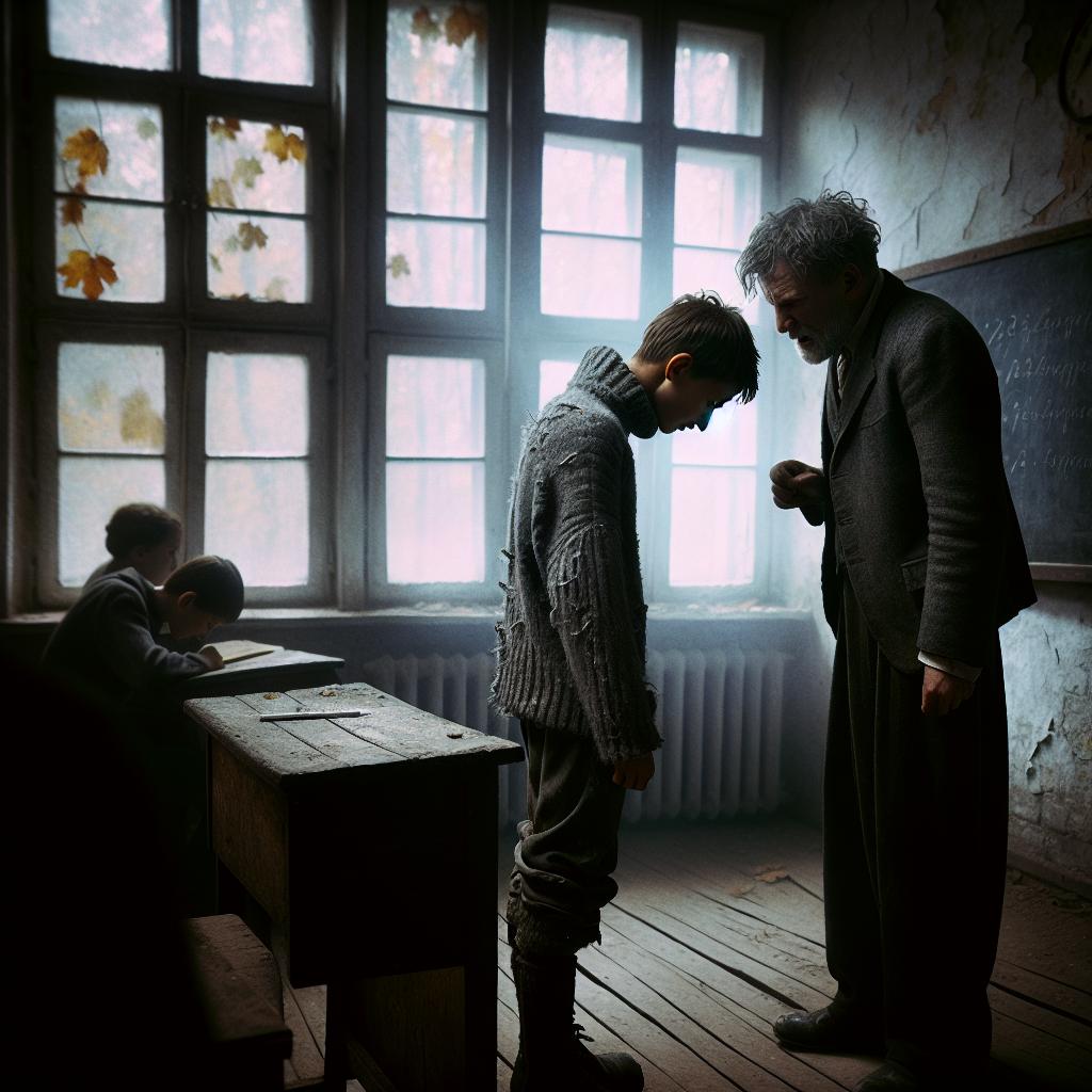 На уроке русского языка царила напряжённая тишина. У доски стоял Александр — ученик седьмого класса, худощавый, растрёпанный, с руками, покрытыми мелкими царапинами. На доске коряво тянулись строки диктанта. Красные пометки учительницы сверкали, будто капли крови.