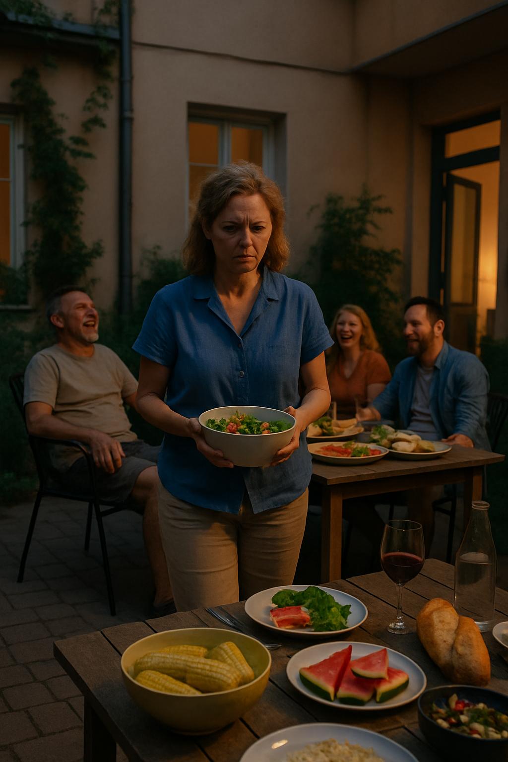 Я в этот момент выносила миску со свежим овощным салатом — уже третье горячее и холодное блюдо за два часа, если не считать закусок, нарезки и домашнего лимонада.