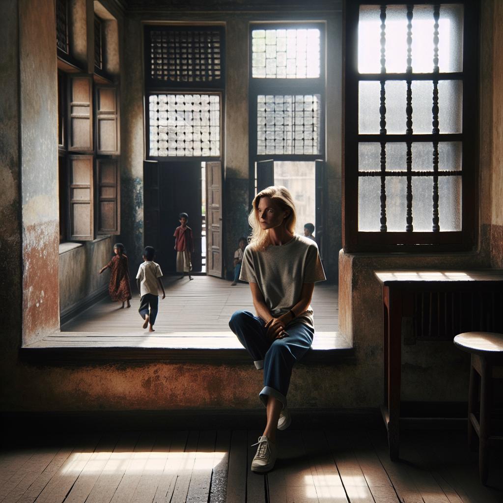 Она стояла у окна, наблюдая, как дети резвятся во дворе.