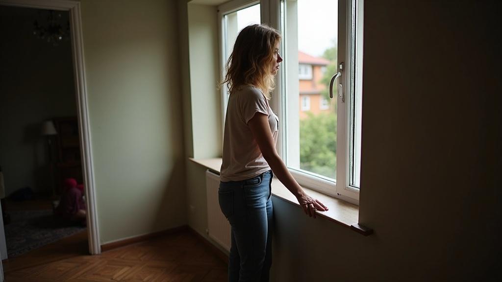 Она стояла у окна, наблюдая, как дети резвятся во дворе.