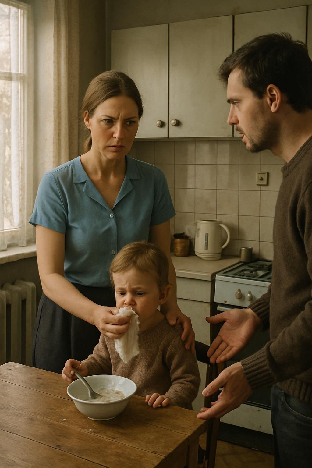 Из рук Марии выпала ложка и с глухим чавкающим звуком упала в недоеденную кашу дочери. Девочка тут же отреагировала: губы скривились, брови сошлись к переносице, из горла вырвался недовольный звук. Не сводя взгляда с мужа, Мария потянулась за салфеткой и аккуратно вытерла подбородок ребёнка.